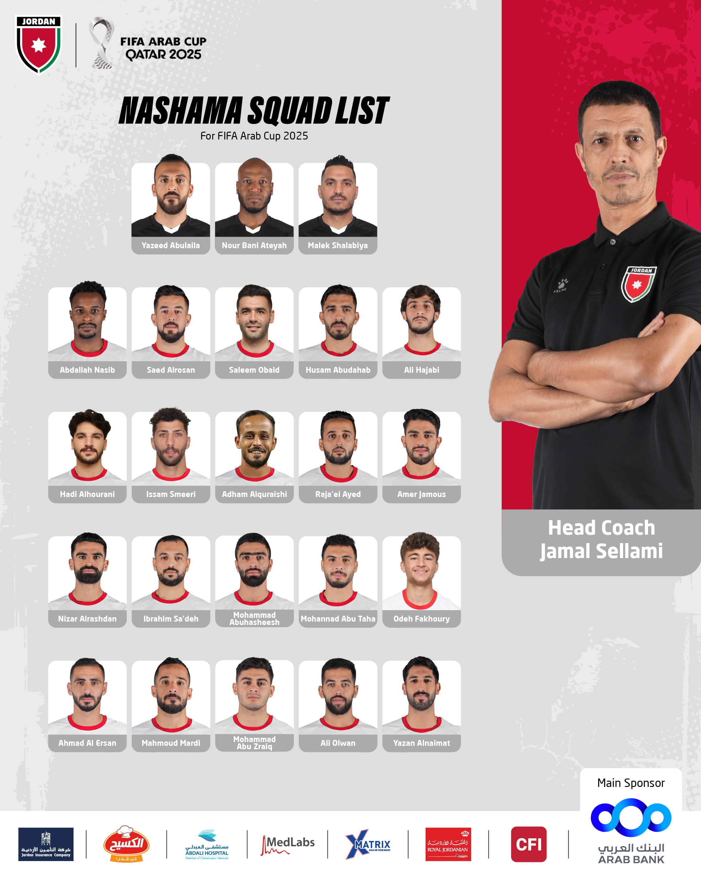 أعلن الجهاز الفني للمنتخب الوطني، بقيادة المدرب جمال سلامي، قائمة النشامى النهائية للمشاركة في بطولة كأس العرب "فيفا 2025" والتي تقام خلال الفترة 1-18 كانون الأول المقبل في العاصمة القطرية الدوحة.