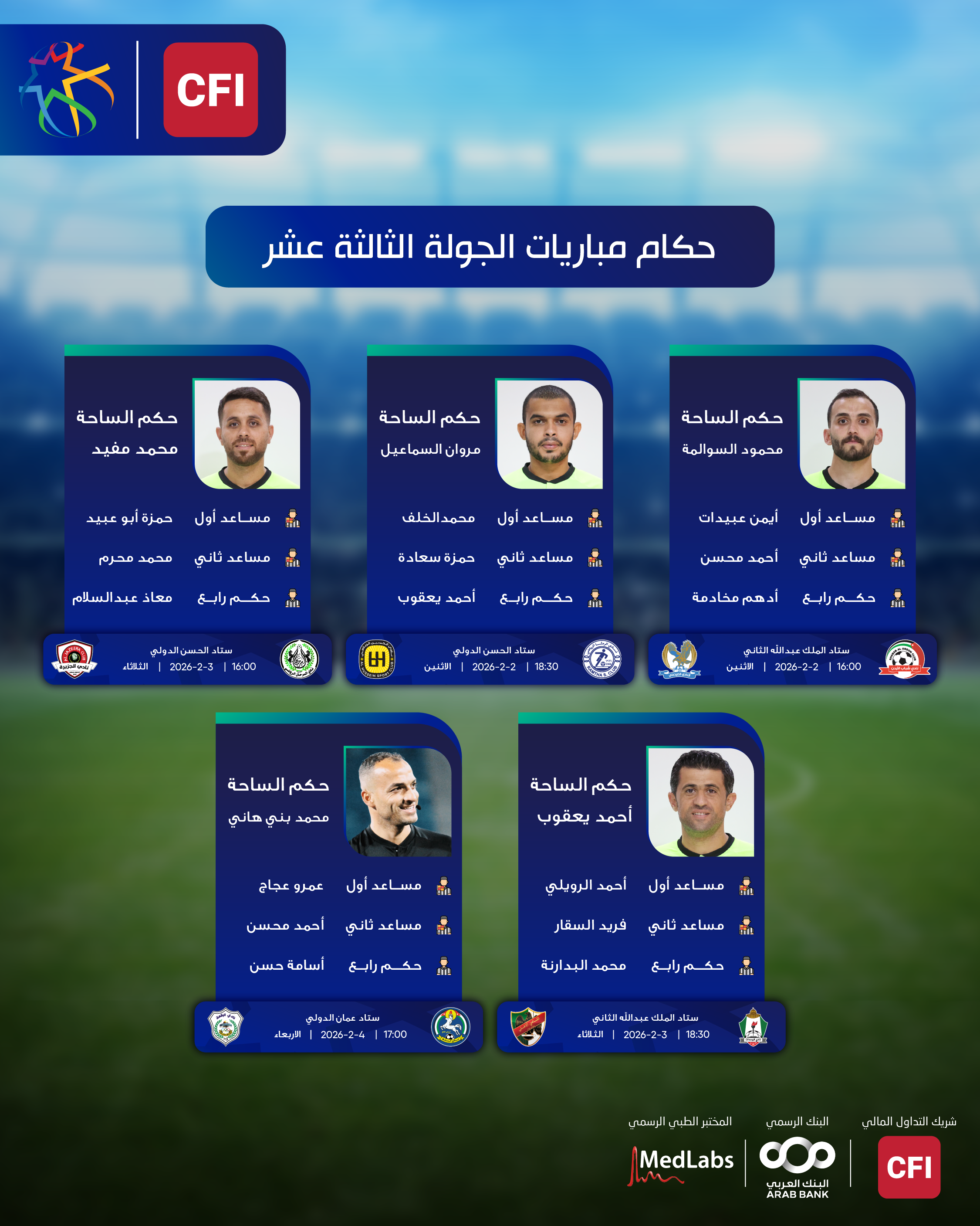 تنطلق غداً الأثنين 2 شباط، منافسات الأسبوع الثالث عشر من الدوري الأردني للمحترفين CFI لموسم 2025/2026.