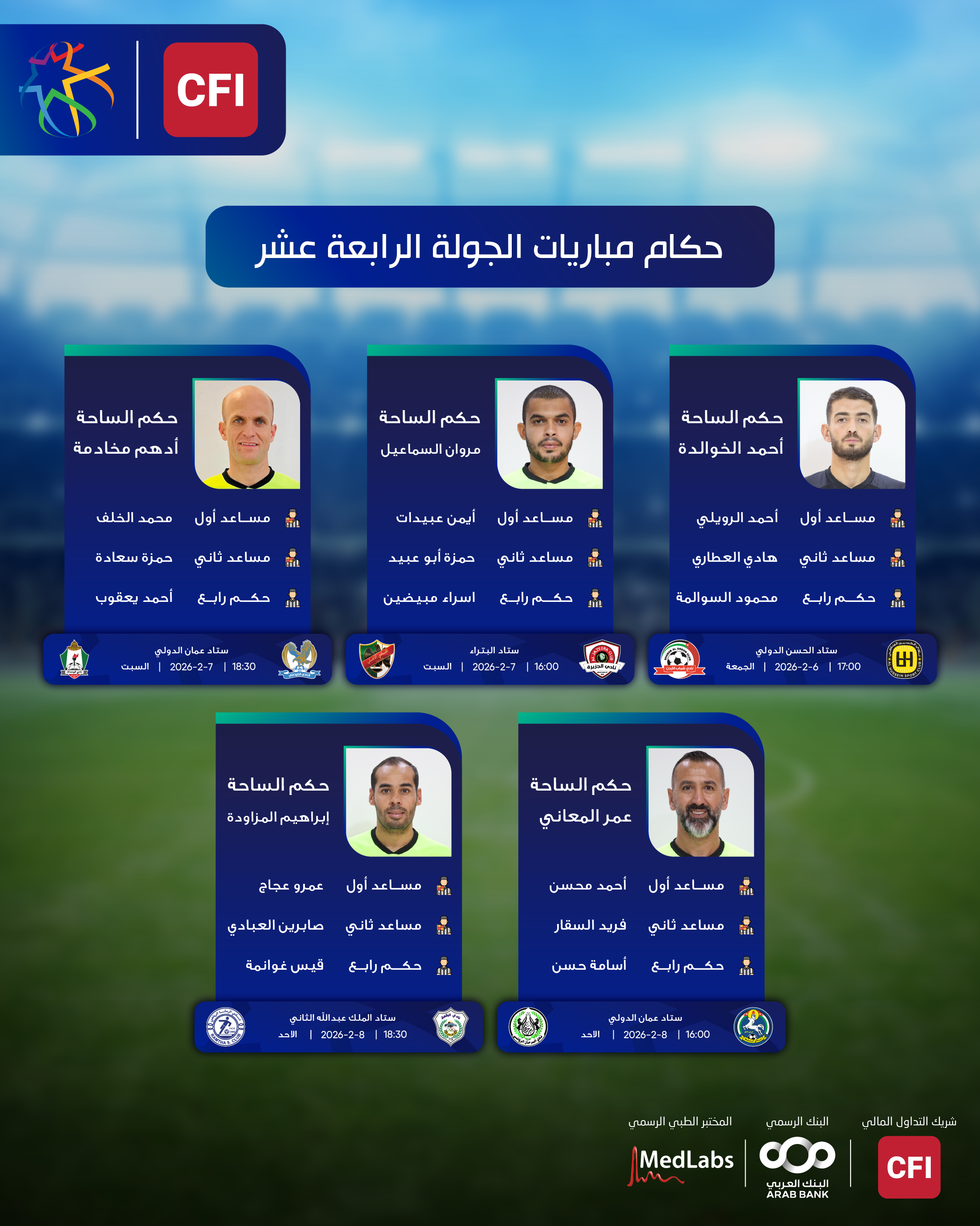 تنطلق غداً الجمعة 6 شباط، منافسات الأسبوع الرابع عشر من الدوري الأردني للمحترفين CFI لموسم 2025/2026.