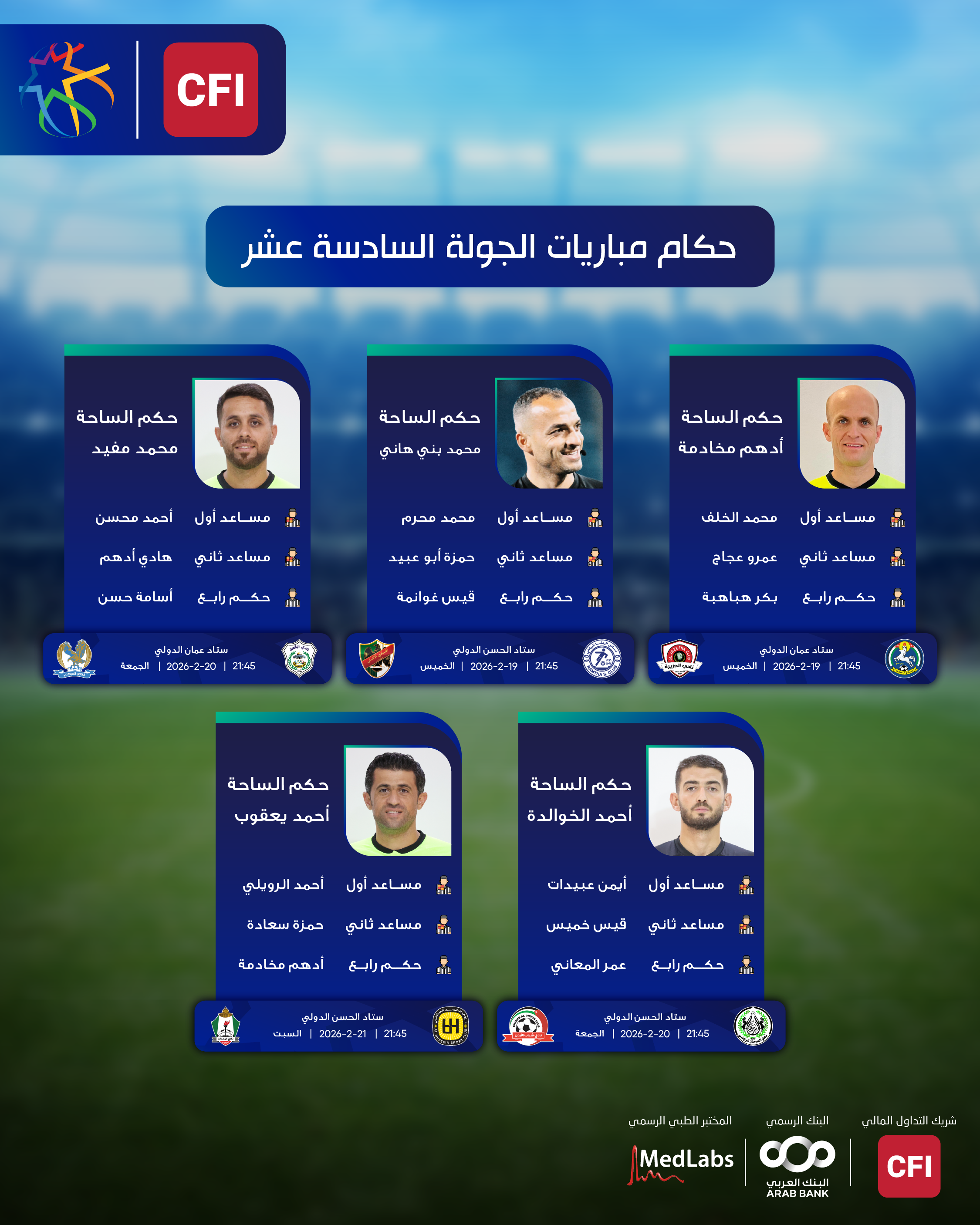 تنطلق غدا الخميس 19 شباط، منافسات الأسبوع السادس عشر من الدوري الأردني للمحترفين CFI لموسم 2025/2026.