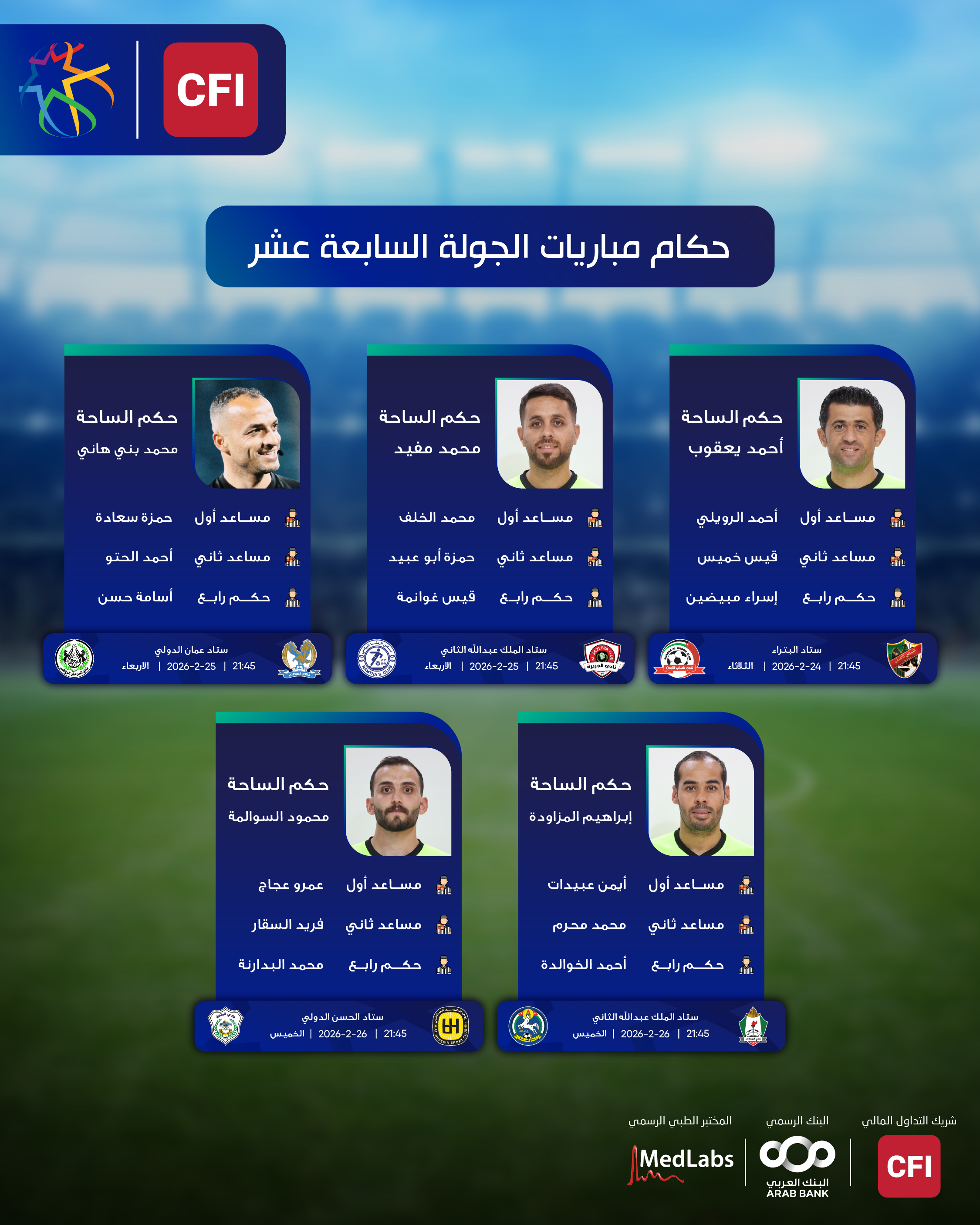 تنطلق غداً الثلاثاء 24 شباط، منافسات الأسبوع السابع عشر من الدوري الأردني للمحترفين CFI لموسم 2025/2026.
