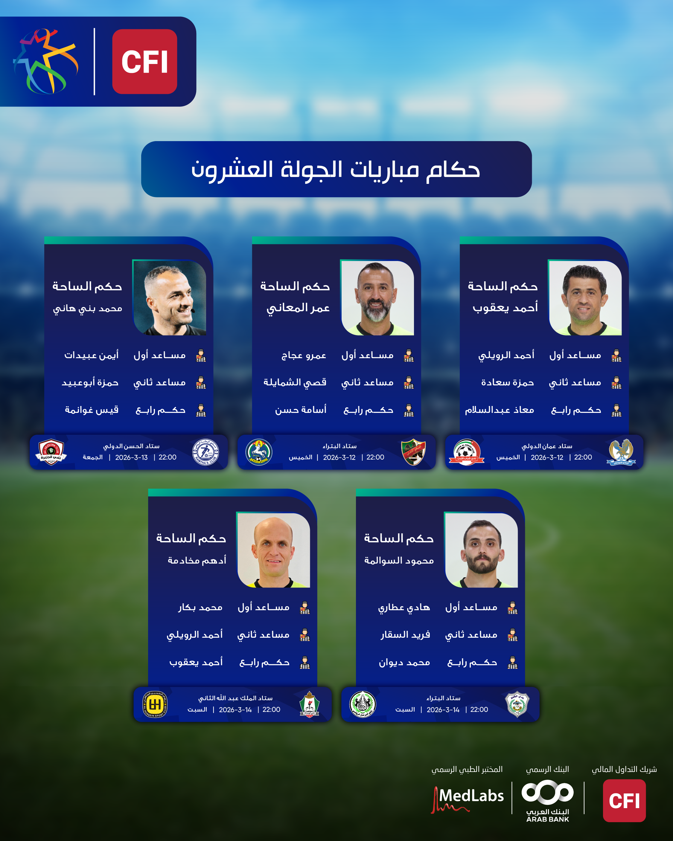 تنطلق اليوم الخميس، منافسات الأسبوع الـ20 من الدوري الأردني للمحترفين CFI لموسم 2025/2026.