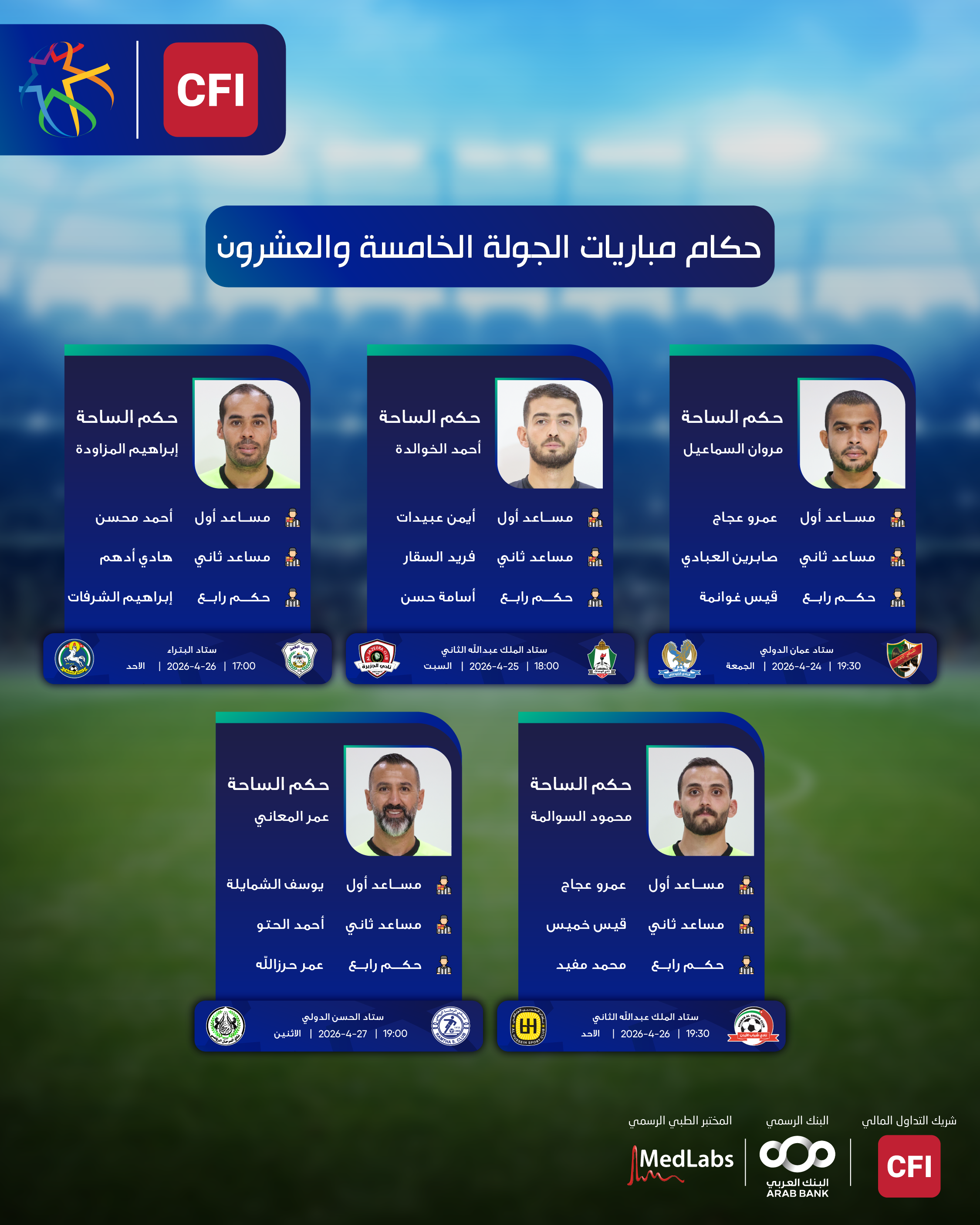تنطلق غدًا الجمعة 24 نيسان، منافسات الأسبوع الـ25 من الدوري الأردني للمحترفين CFI لموسم 2025/2026.